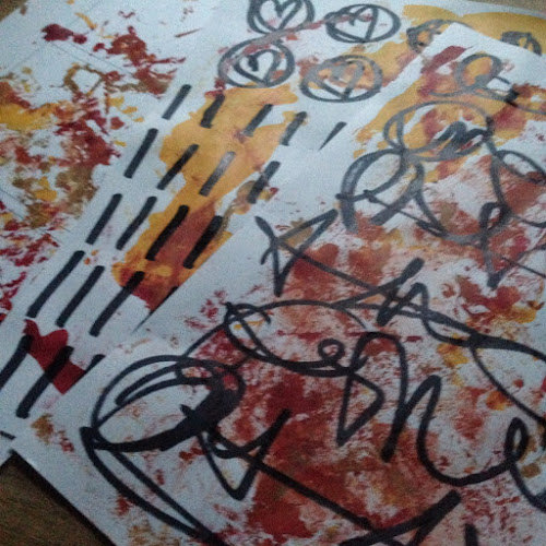 s in reds, yellows and browns. I added some random lines and marks with a large Sharpie Magnum